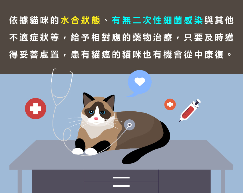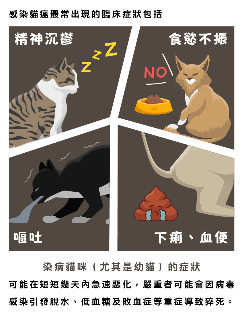 染病貓咪(尤其是幼貓)的症狀可能在短短幾天內急速惡化,嚴重者可能會因病毒感染引發脫水、低血糖及敗血症等重症導致猝死。