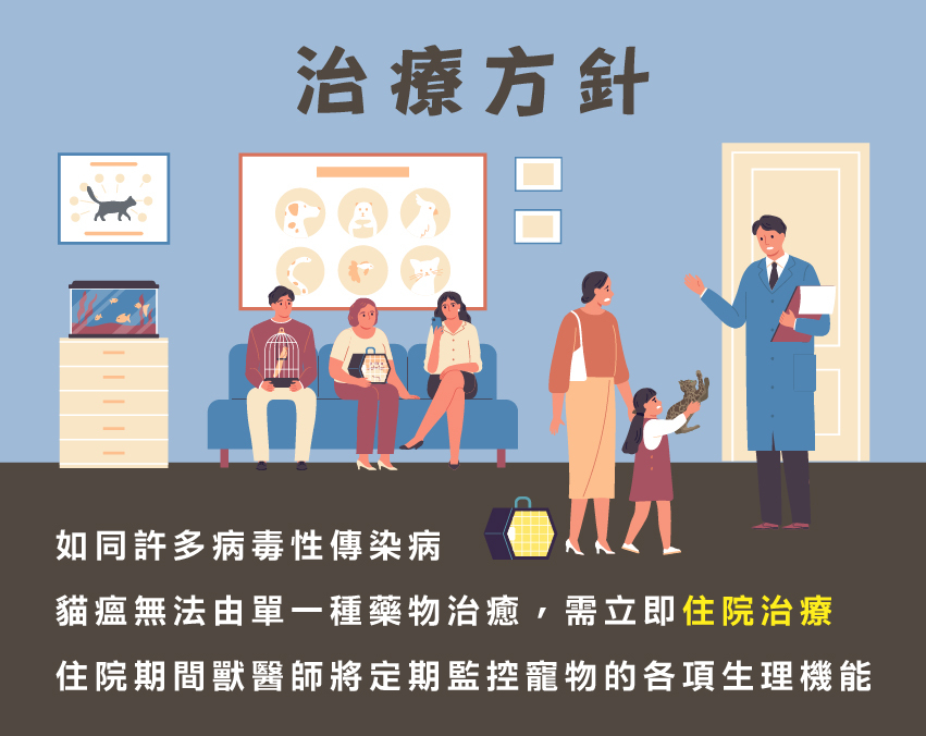 如同許多病毒性傳染病,貓瘟無法由單一種藥物治癒,大多數的案例需立即住院治療,住院期間獸醫師將定期監控寵物的各項生理機能,依據貓咪的水合狀態、有無二次性細菌感染與其他不適症狀等,給予相對應的藥物治療,只要及時獲得妥善處置,患有貓瘟的貓咪也有機會從中康復。